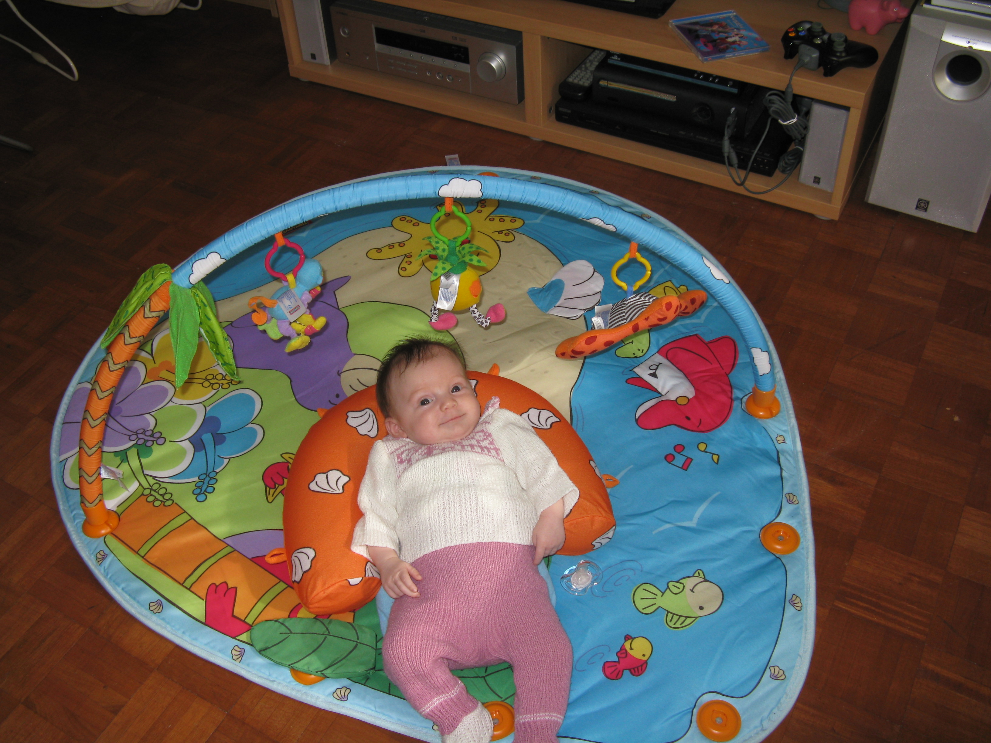 j’ai maintenant 6 semaines, 4,620 kg (d’après la pesée d’hier) et je suis très éveillée! Je passe la plus part de la journée à regarder maman faire tout plein de choses dans la maison, à lui parler (j’adore bouger mes lèvres comme les grands pour raconter plein de choses!) et à sourire, tout cela de mon îlot!
