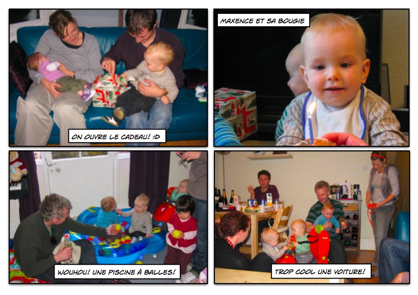 Mon copain Maxence m’a invité dimanche à sa fête d’anniversaire. Il est drôlement grand maintenant! Il a 1 an! J’espère que j’aurais 1 an bientôt et qu’on fera une fête avec tous mes copains aussi: il y avait une piscine à balle et une grosse voiture!