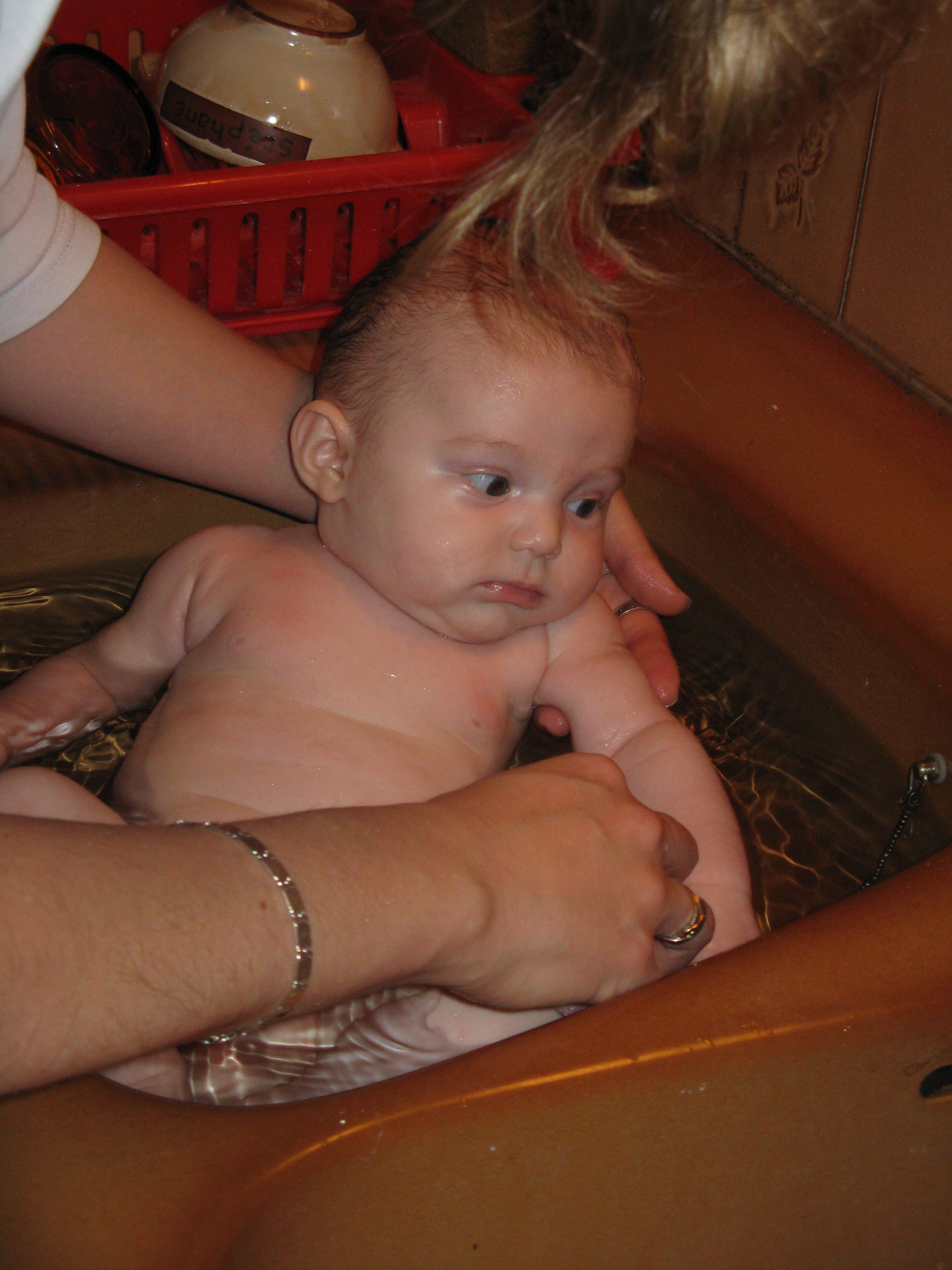 Comme papi Raveton n’a pas de baignoire de bébé, on m’a lavée dans l’évier de la cuisine de papi! J’étais pas tout à fait rassurée, c’était tout petit et les bords étaient froids, mais bon, j’étais quand même toute propre après! :D