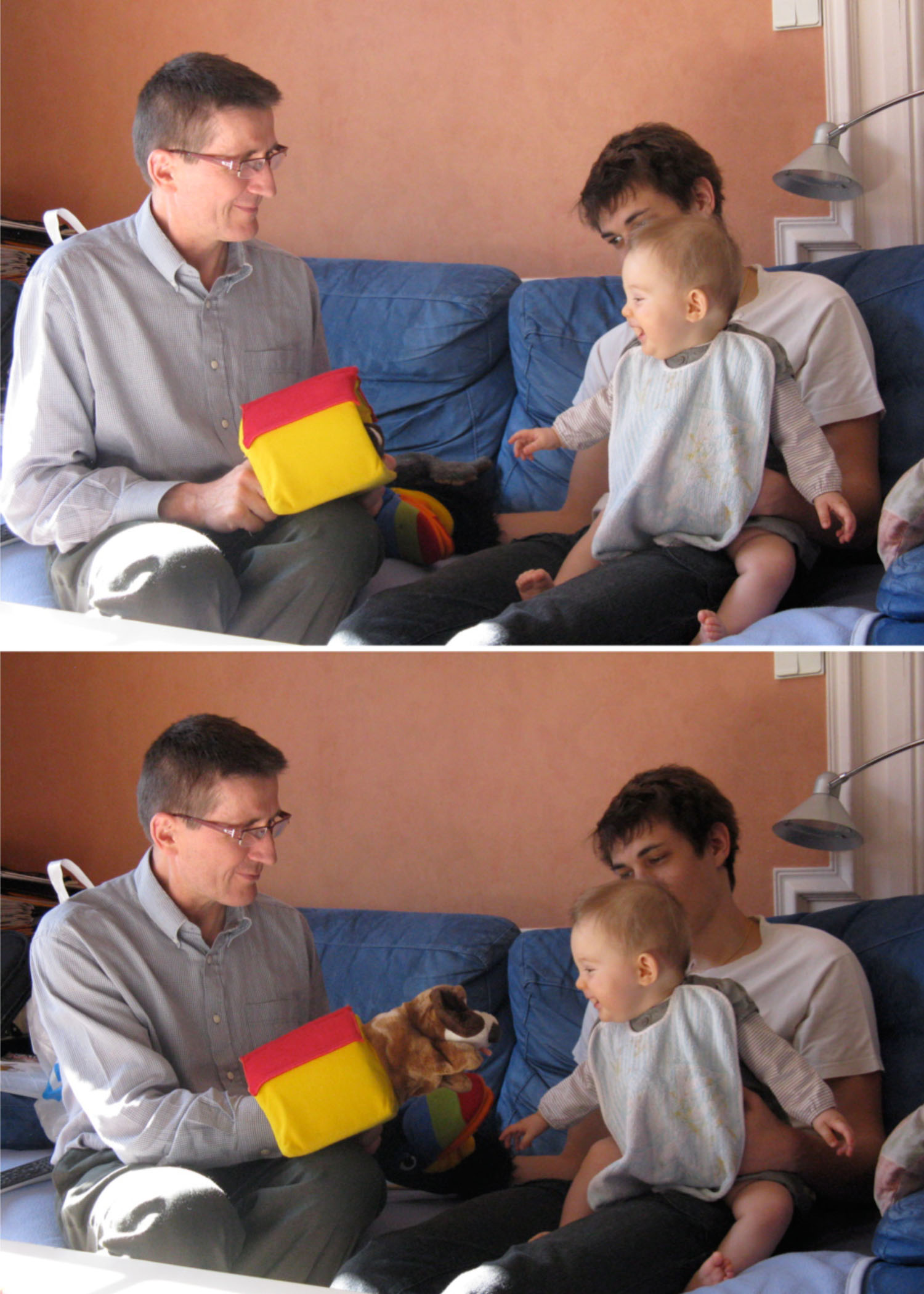 Chez Papou et Mamoune, tonton François m’a joué de douces mélodies pendant que je prenais mon petit déjeuné. S’il s’arrêtait de jouer, moi aussi je m’arrêtais de boire, pour bien lui montrer que je voulais qu’il joue encore! 😀