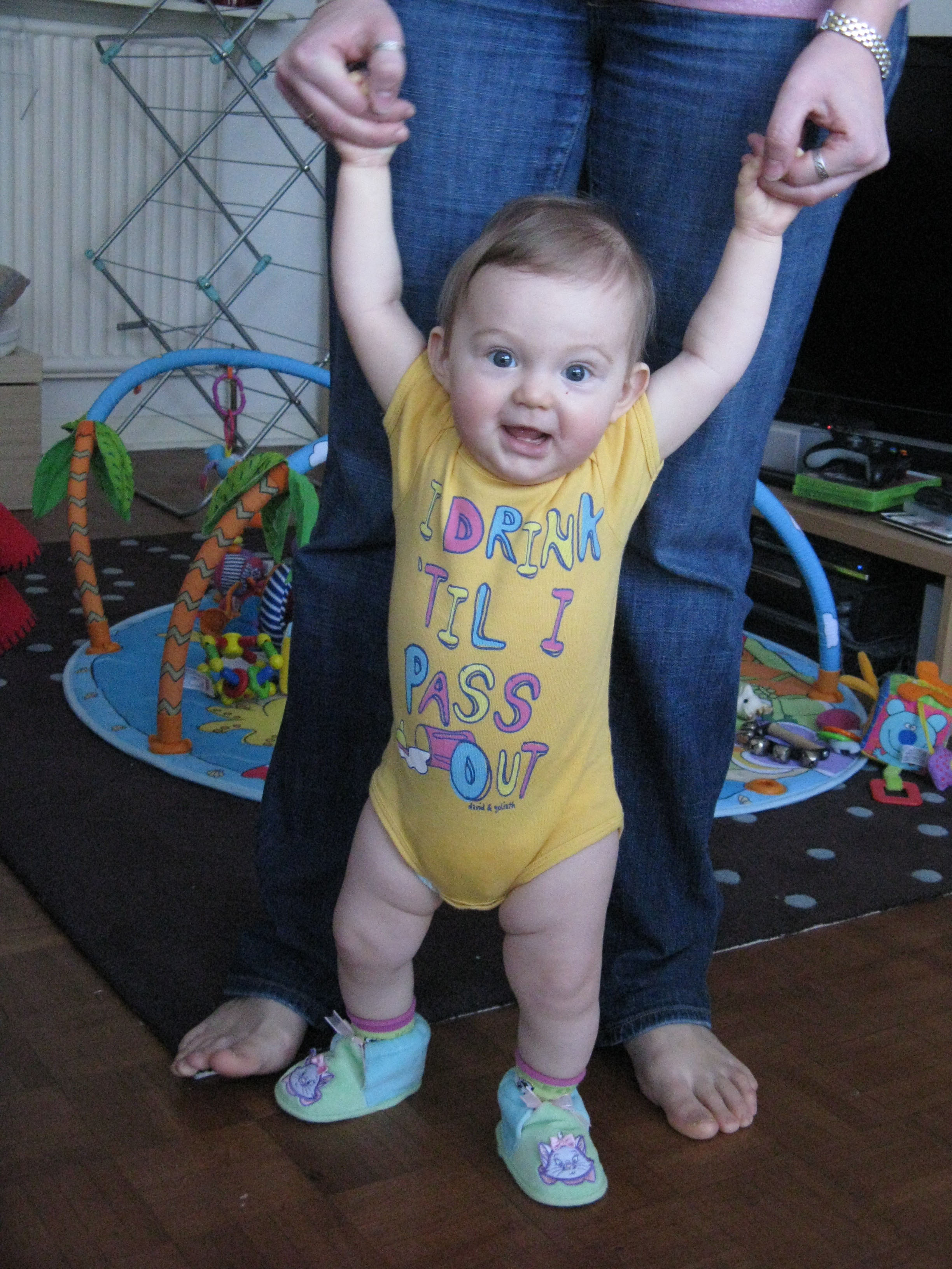 Bon alors, comme je ne sais toujours pas marcher toute seule (et c’est pas faute de m’entraîner !) et que je déteste être sur le ventre, j’ai trouvé un moyen d’avancer : je pousse sur mes jambes tout en étant allongée sur le dos.