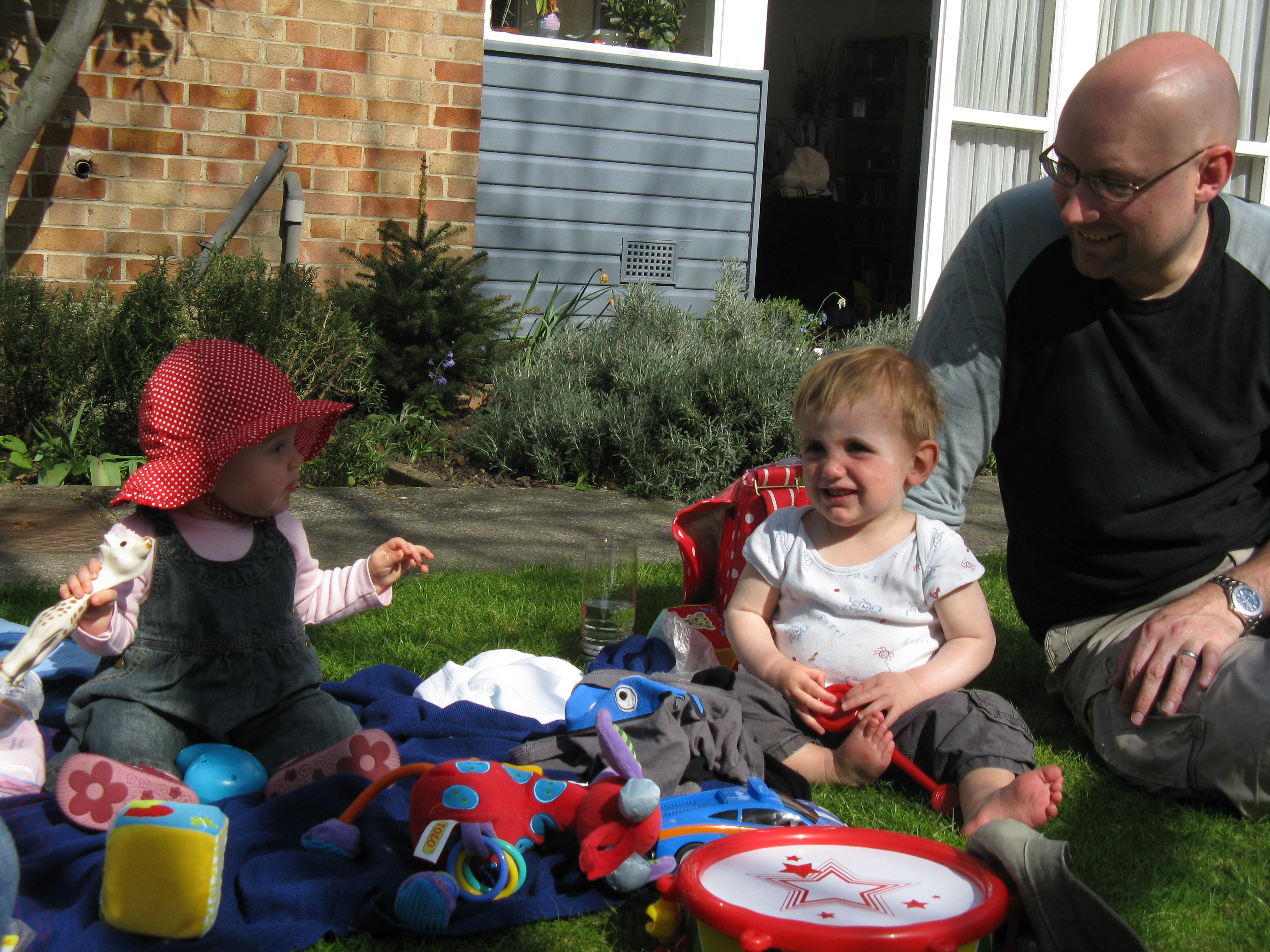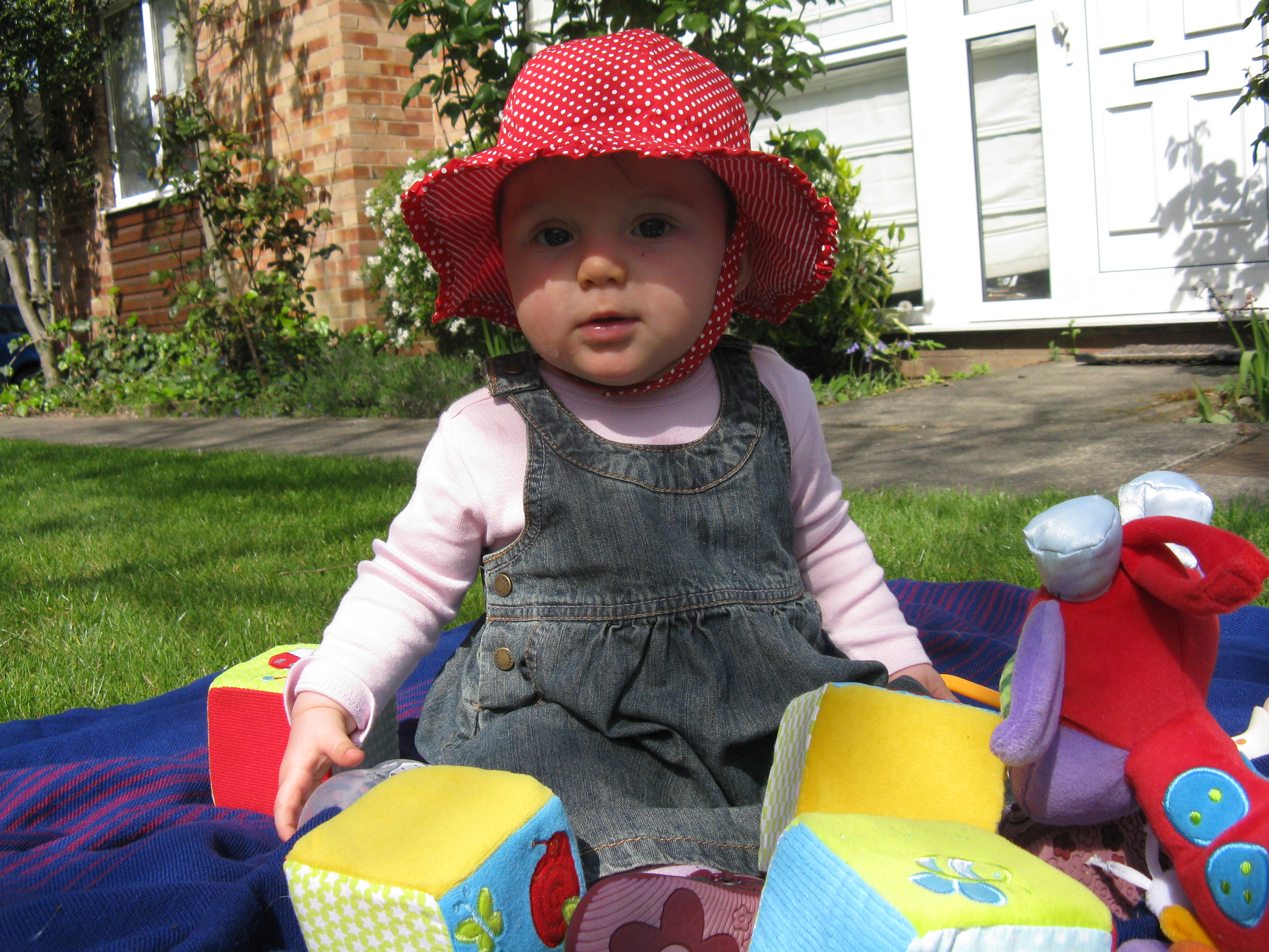C’est le printemps, les oiseaux chantent, je suis dehors, sur l’herbe avec mon beau chapeau et tous mes jouets…aaaaah ce que c’est bien le printemps, vivement l’été!
