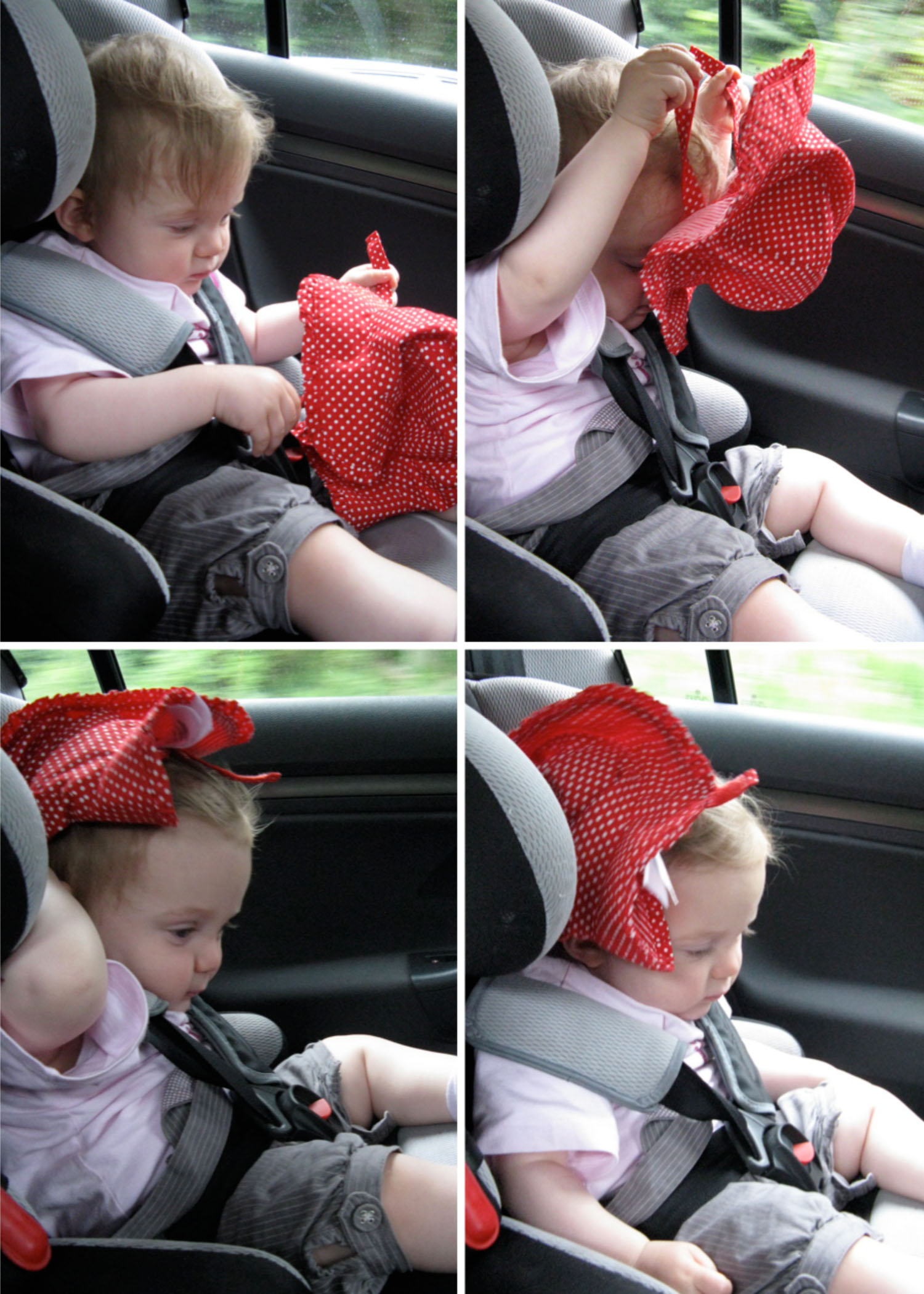 Dans la voiture je m’ennuyais un peu donc je me suis amusée à essayer de mettre mon chapeau. Et j’ai même réussi mais maman a pas eu le temps de prendre la photo, je l’avais déjà retiré pour réessayer!