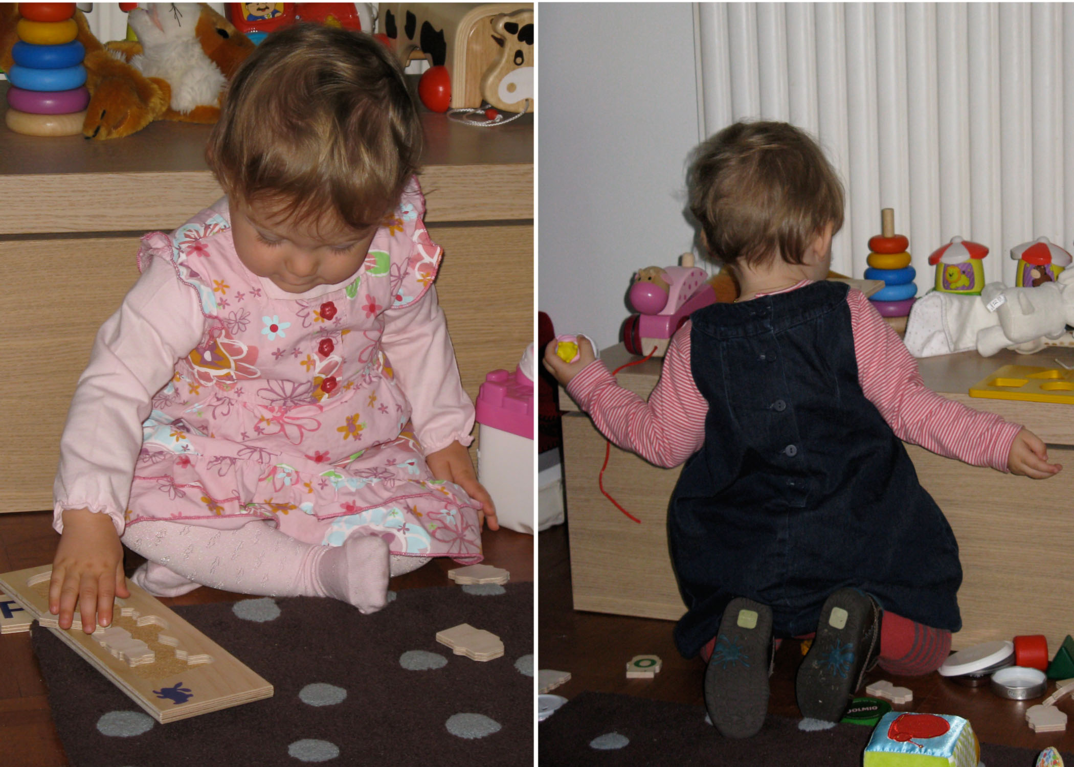 Je commence à trouver différentes positions pour jouer plus confortablement: assise les jambes croisées pour les puzzles, à genoux devant mon coffre à jouets pour être à la bonne hauteur (et mieux tout mettre par terre!).