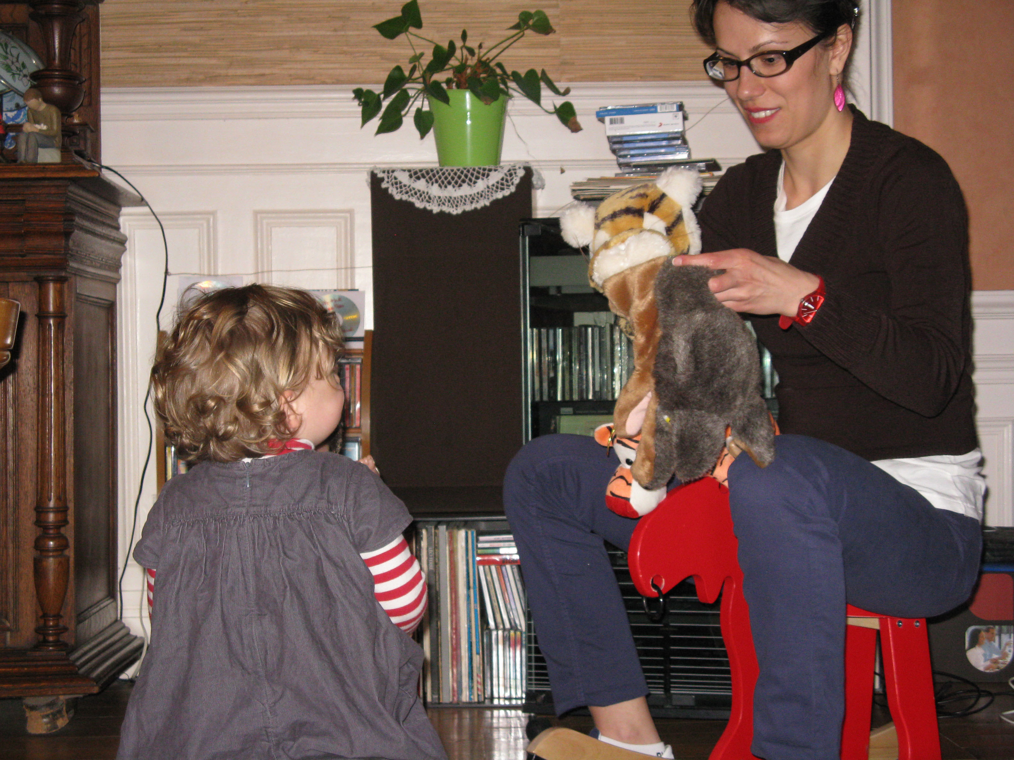 Tata Livia aime beaucoup jouer avec moi: elle monte même sur mon cheval à bascule, joue avec les marionnettes, mes poupées (maman dit qu’elle joue à Chucky, mais c’est pas ça le prénom de ma poupée!)…etc