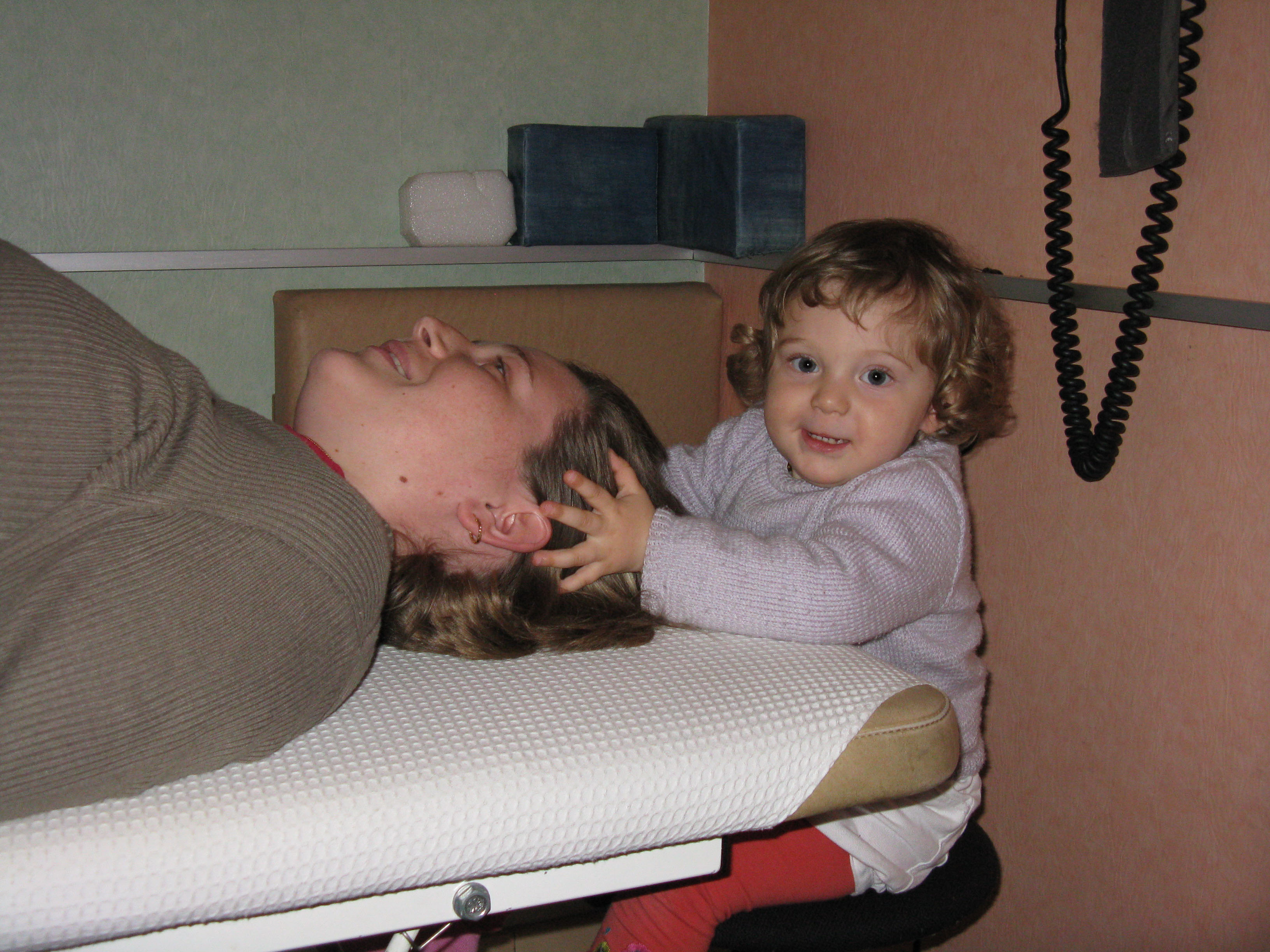 Maman quand elle a mal au dos, Papou lui fait de l’ostéo. L’autre jour, je l’ai aidé à faire de l’ostéo à maman, je faisais comme lui, après être montée sur son tabouret! ^^