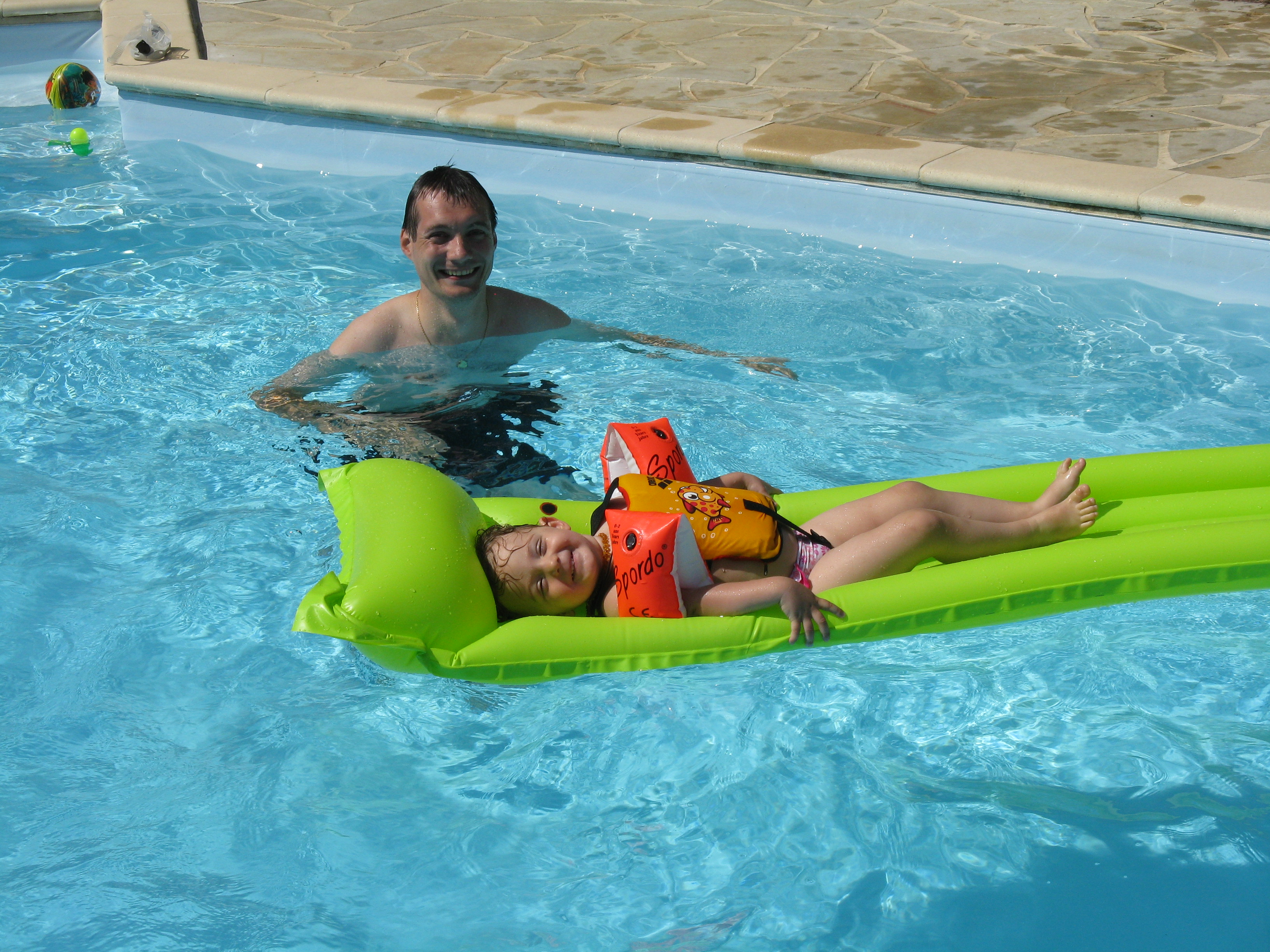 Maintenant, dans la piscine avec mes bouées, je m’amuse comme une folle! Je nage, je montre mes pieds, j’éclabousse…