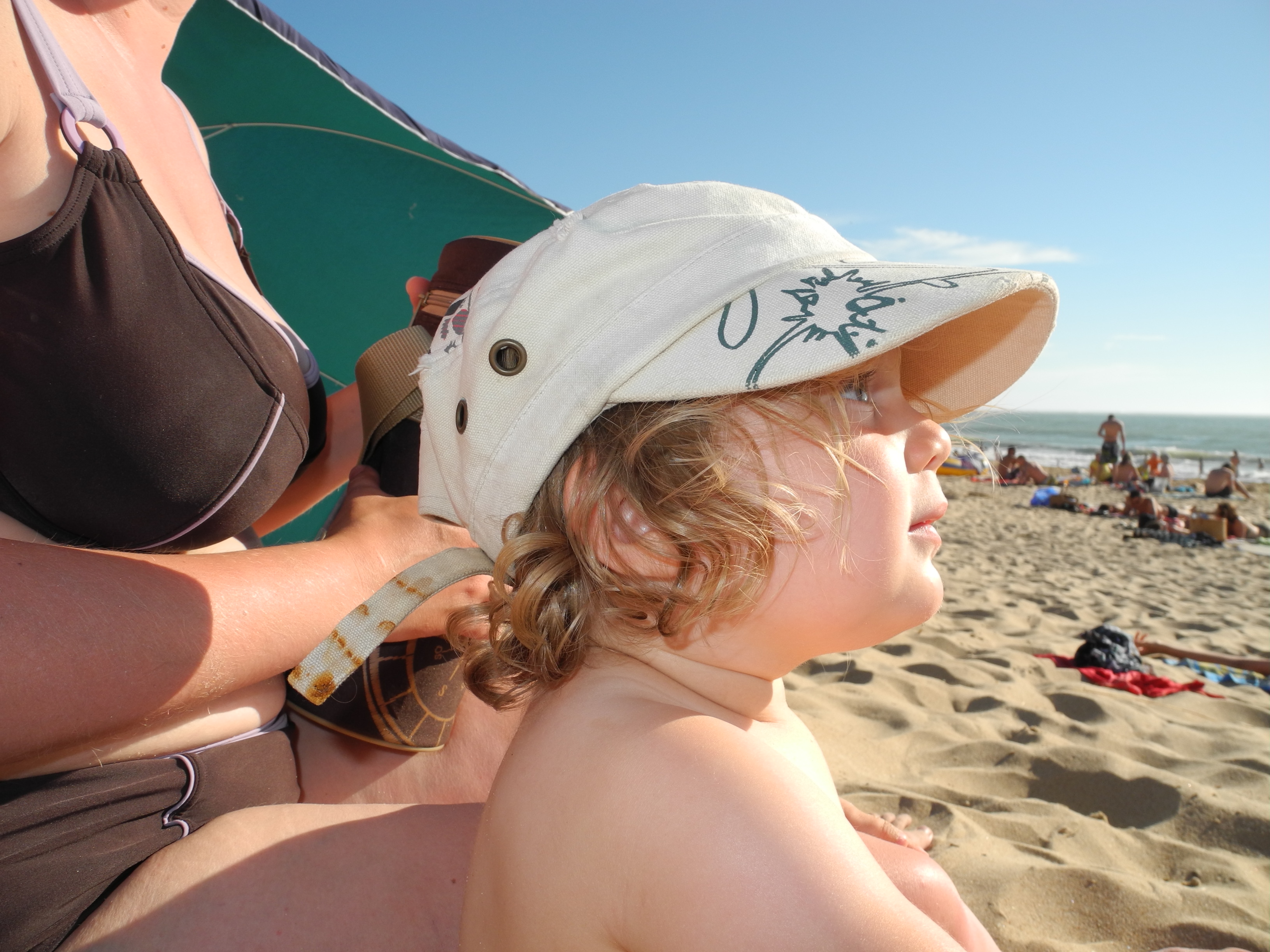 Il faisait chaud sur la plage, du coup, Papa m’a prêté sa casquette.