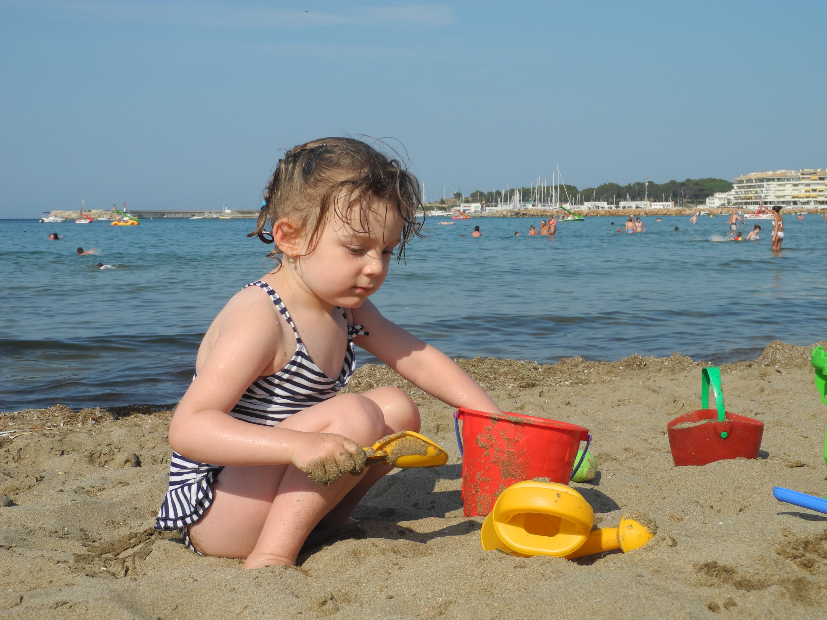 A la plage, pas question d’y aller sans mes jouets! Je fais plein de choses avec…à manger, des châteaux, des pâtés,… j’arrose les pieds de papa et maman quand ils ont trop chaud avec mon arrosoir…